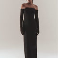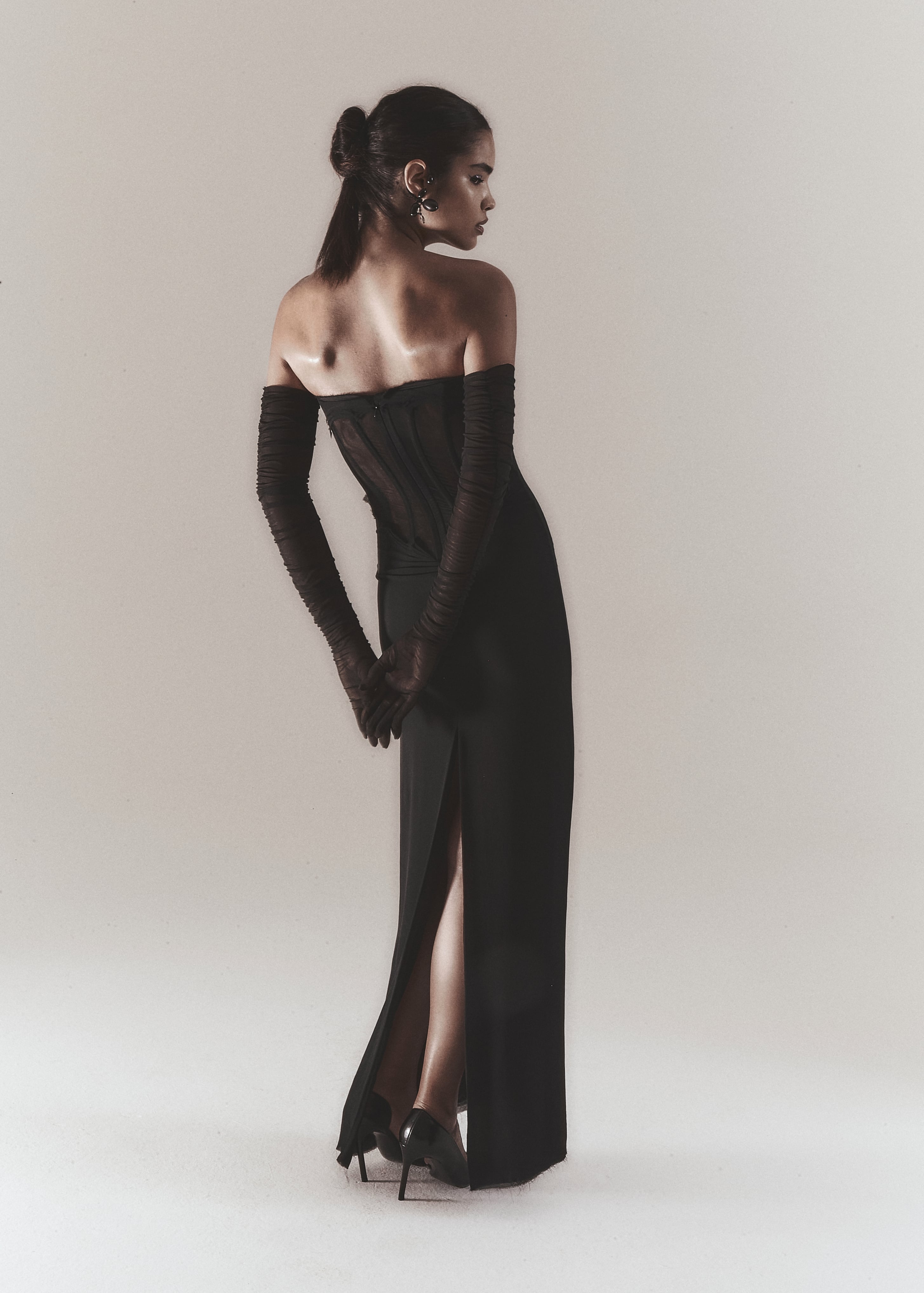 The focus here is the silhouette, there is no going around it. It shapes, sculpts and conforms to all right curves of the body, culminating to a column like point at the hem. The raw edges at the top of the gown are a foretelling to what awaits just behind.