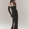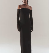 The focus here is the silhouette, there is no going around it. It shapes, sculpts and conforms to all right curves of the body, culminating to a column like point at the hem. The raw edges at the top of the gown are a foretelling to what awaits just behind.