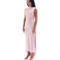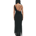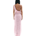 The back is daringly open, ready to catch a tan and glisten under the summer sun. Bridal buttons line the left side and release into a high slit from the mid-thigh.