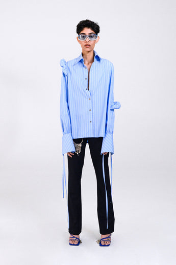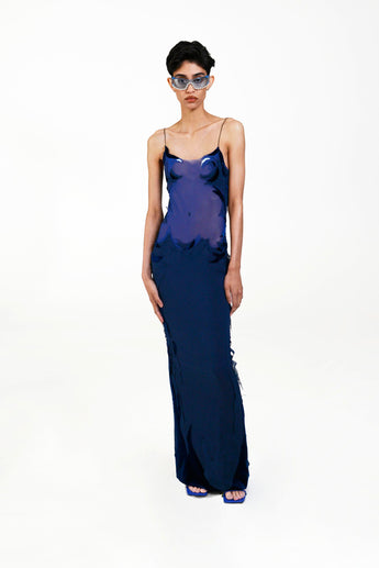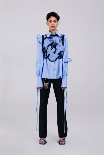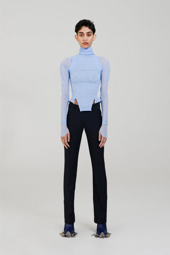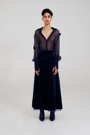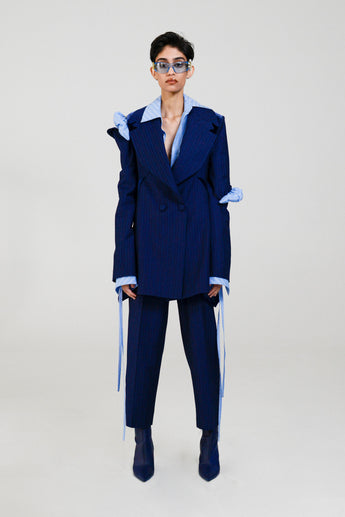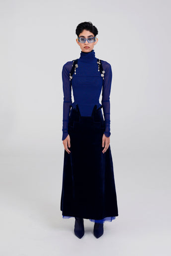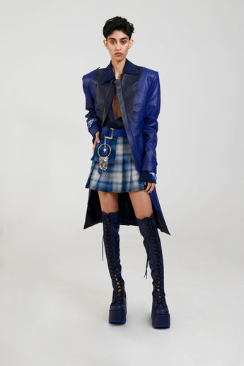 In this collection you’ll find nods to a myriad of inspirations. As my Armenian culture plays the most integral part in my design process, there are A-line silhouettes which call to Armenian garb. Velvets, ancient coins of kings past, and bird motifs, taken from illuminated manuscripts, which have been spun from cashmere, silks and mohair. Wardrobe essentials are carefully rethought and made in the finest of Italian fabrics. Tailoring is explored, which harken back to my years spent living in London. Puffs bursting from suiting seams call to the internal supports of romantic-era sleeves. Leather is cut in curves and flames as they slither along the body in electric blue. All this crescendo’s to a slinky, sheer dress that is layered with torn chiffon. Each layer is hand stitched, to create a sort of body mapping. The details are what shine here, whether it be the cuts, coins or embroideries, there are little treasures hidden to discover all throughout.