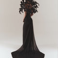 The intricate plissé around the bodice evokes the memory of Madame Grès. Each row is meticulously placed and hand stitched with the greatest of care. It contours around the breasts and plunges down the back into a cascade of a crepe chiffon train. The pleats start to twist around the branches of the tree, creating the spiraling layer of bark.